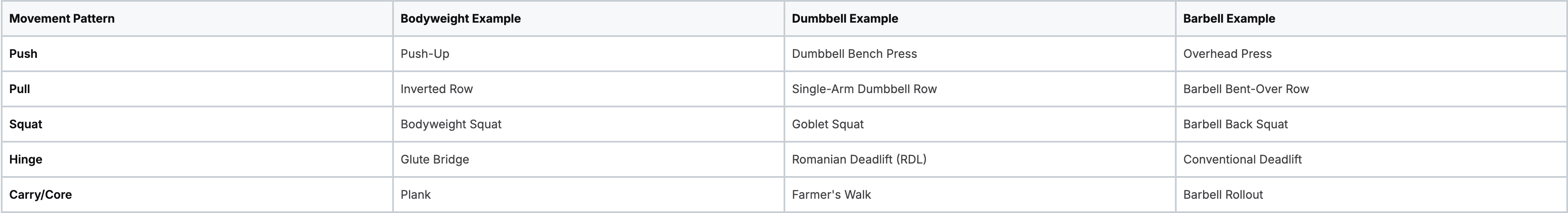 This table shows how to plug different exercises into these patterns based on available equipment.
